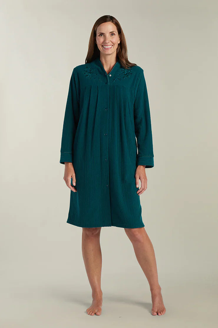 I took a chance buying online, without seeing or feeling it or trying it on. It's the nicest robe I've had in years--I'm in my 60's. I caught it on sale too! It's not too bulky nor too light weight--I get hot easy, but I also get a chill in the morning and at night. The sleeves are perfect length, not bulky & don't get it the way of me doing things. Good quality zipper, nice pockets, great color for me, not too long, mid-shin length, covers my chest but stays out of my way, not hot, washes well. I love it.
