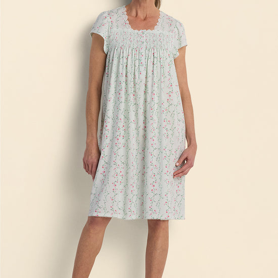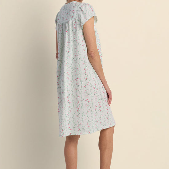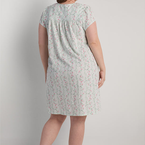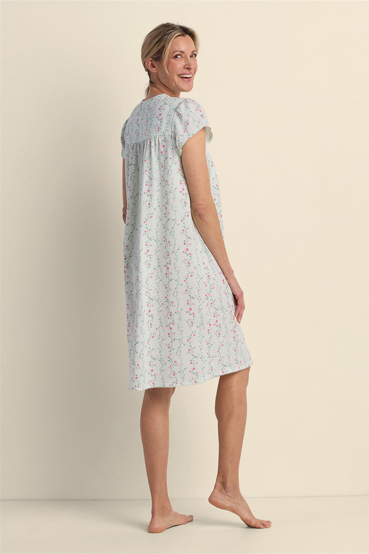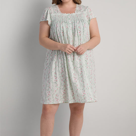 • Silkyknit Short Floral Nightgown - Fresh and breezy, this short silkyknit nightgown brings a touch of charm with its mint floral print, simple Henley neckline, and soft cap sleeves.
