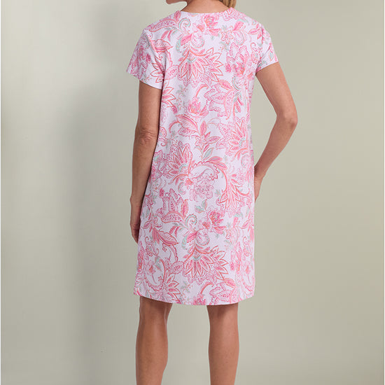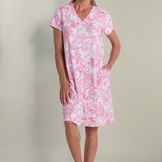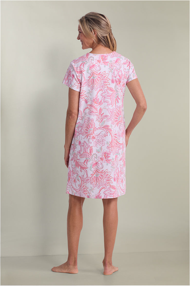 Wrap yourself in comfort and style with this beautiful short robe featuring an intricate coral floral tapestry print that elevates your loungewear to an art form. Constructed from premium interlock knit fabric, a durable 60% cotton and 40% polyester blend, this robe offers substantial weight and warmth without feeling heavy or restrictive. The flattering v-neckline and short sleeves create a feminine silhouette, while the convenient snap closures make it easy to wear and adjust throughout your morning or evening routine.