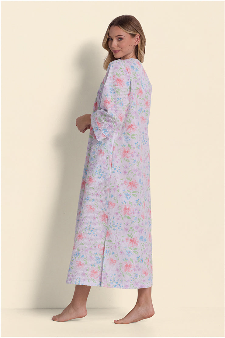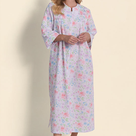 Seersucker Long Floral Robe with Zip-Up Front - Soft, lightweight, and charming, this seersucker robe brings a breath of fresh air with its pink floral stem print. Designed with a round neckline and 3/4 length sleeves, it offers just the right amount of coverage for comfort throughout the day. A smooth zip front and easy-access pockets make it a favorite for slow starts and quiet evenings.
