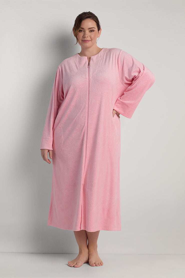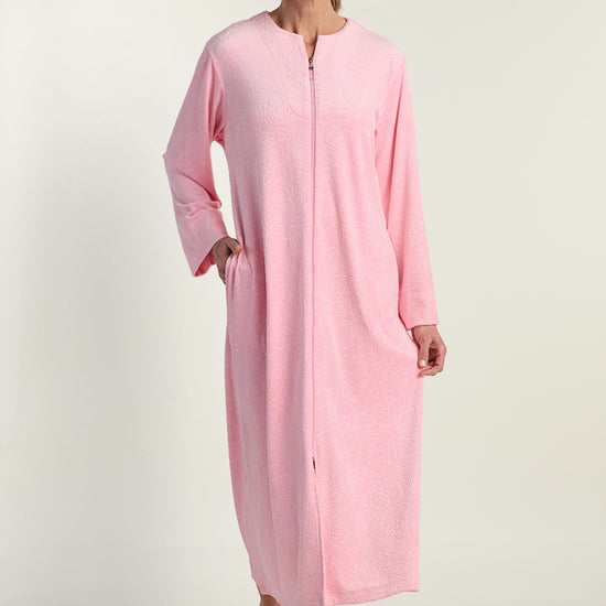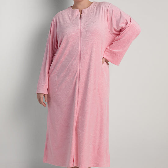 Fleece Long Robe - Experience cloud-like comfort in our plush fleece robe in delicate Pink Dust. This full-length design features a convenient zip-front closure, cozy long sleeves, and practical pockets. The supremely soft fleece fabric envelops you in warmth while the relaxed silhouette ensures ease of movement, making this the perfect companion for chilly mornings and cozy evenings year-round.