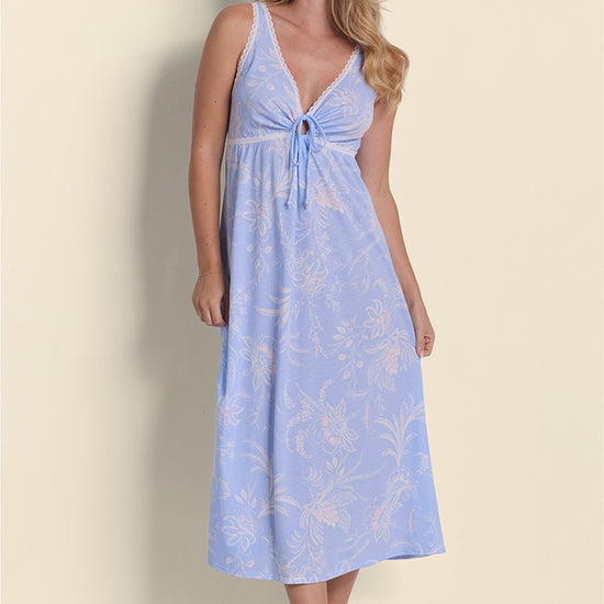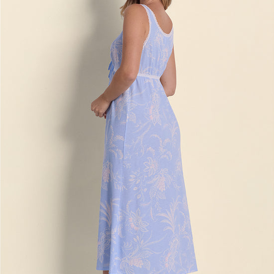 Embrace timeless elegance with this stunning blue wildflowers nightgown that combines vintage charm with modern comfort. Crafted from a luxurious 60% cotton and 40% polyester silkyknit blend, this sleeveless nightgown drapes beautifully while offering breathable all-night comfort. The flattering v-neckline adds a touch of sophistication, while the flowing long length provides graceful coverage for a classic sleepwear look.
