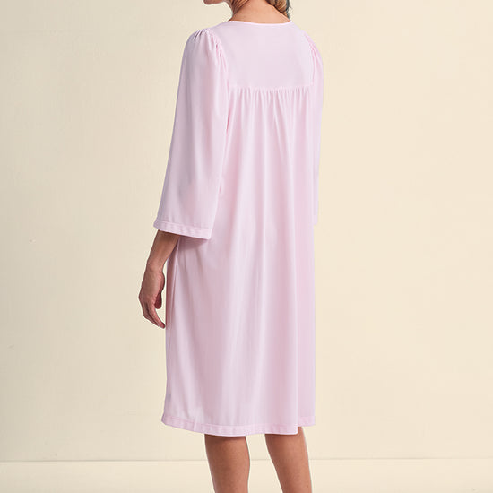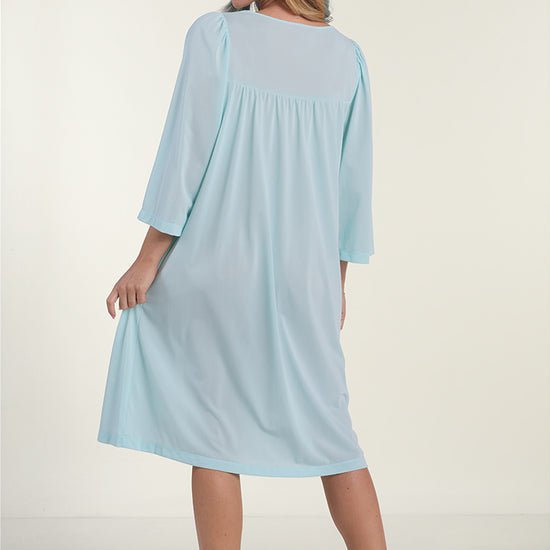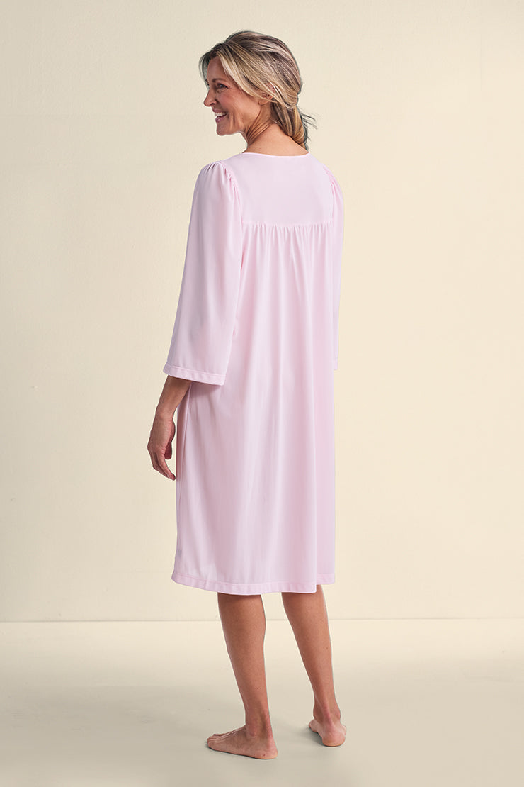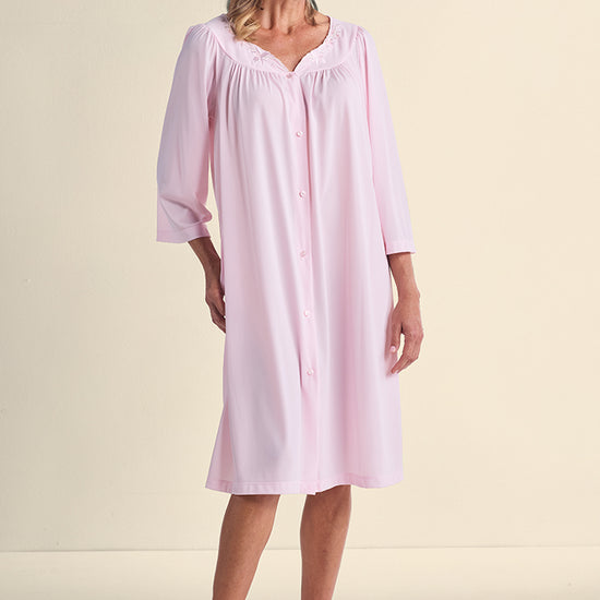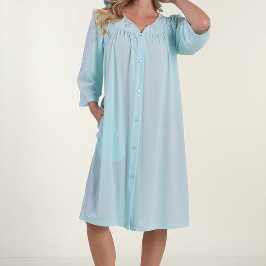 NYLON TRICOT ROBE: A classic choice, our nylon tricot short button front robe features side pockets and 3/4 sleeves. Perfect robe.