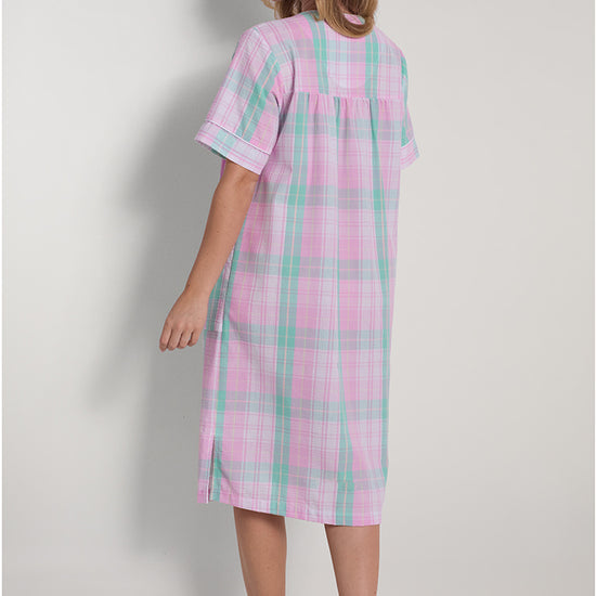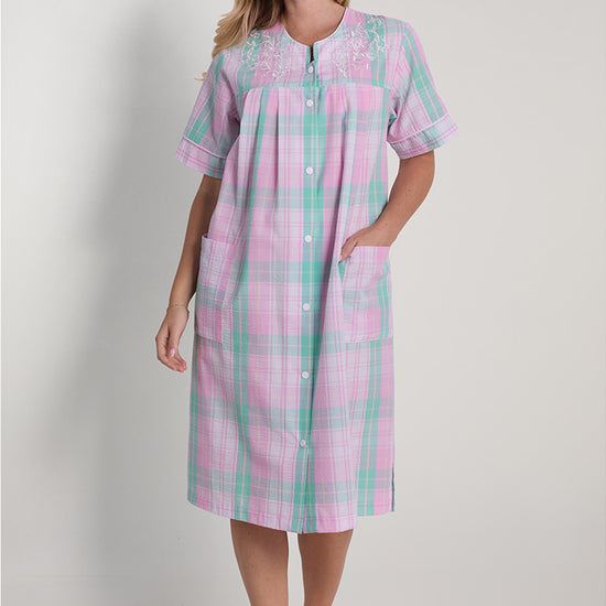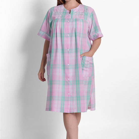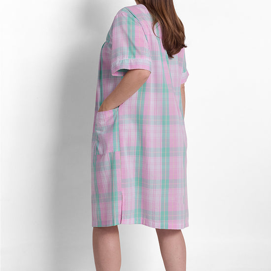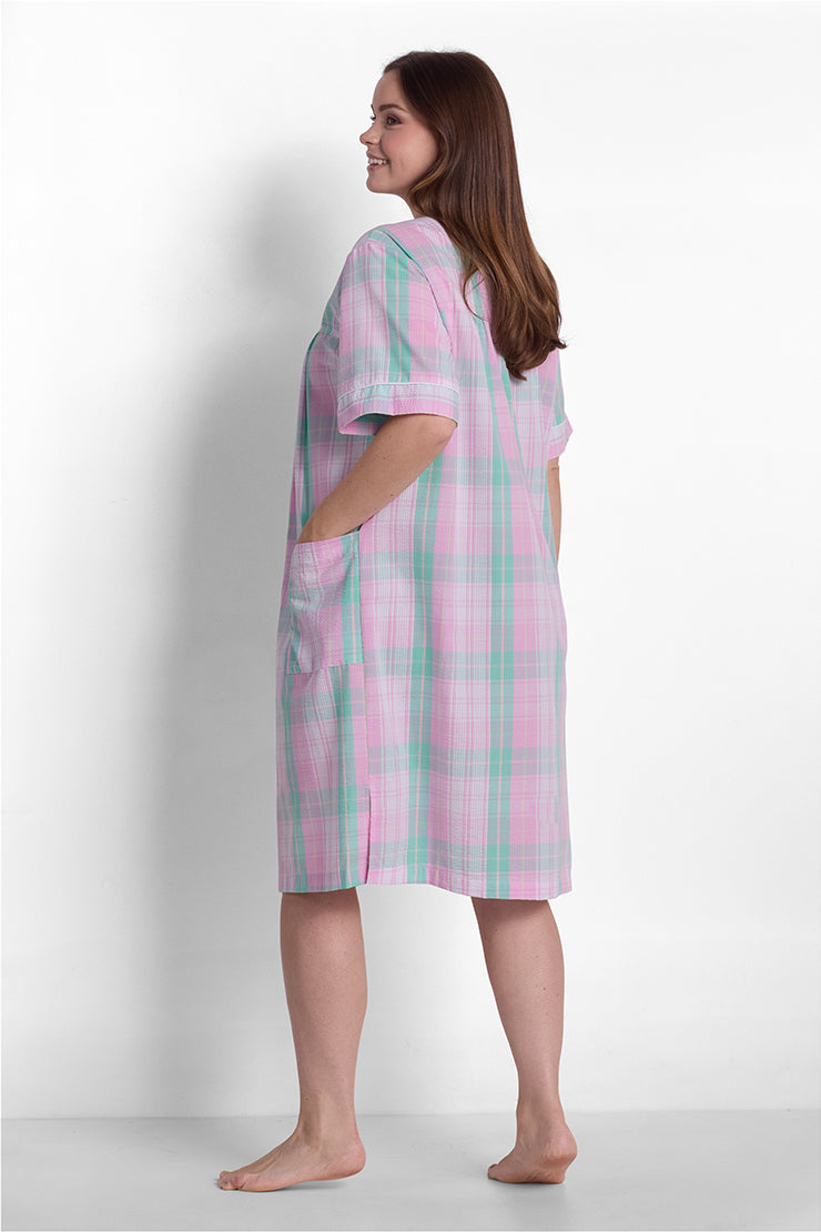 Stay cool and comfortable with this lightweight seersucker short robe featuring short sleeves and a classic round neckline. Crafted from a breathable 55% cotton and 45% polyester blend, this robe is ideal for warm weather lounging or getting ready in the morning. Designed with practical snap closures for quick, easy wear and two functional patch pockets for convenience. The textured seersucker fabric offers enhanced airflow for all-day freshness. Machine washable and tumble dry low for simple care and long-lasting wear. Available in sizes S-L and plus sizes 1X-3X in large mint/pink plaid print, this imported robe brings classic style and practical comfort to your daily routine.